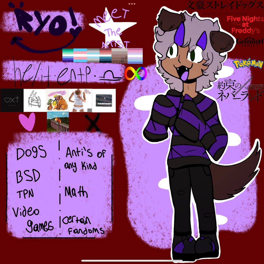 Gaming, Drawing, Cosplaying, Fursuiting, Cavetown, Rebzyyx, Bungo Stray Dogs, Your Turn To Die, Five Nights at Freddy’s, The Promised Neverland, My Little Pony, Bluey, Mystic Messenger, Promare, Devil man, Omori, Genshin Impact, Metal Family, Helluva Boss, The Owl House, Steven Universe, Doukyusei, and LOTS more.